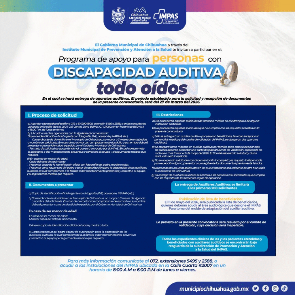 El Gobierno Municipal de Chihuahua anunció la apertura de la convocatoria “Todo Oídos”, un programa impulsado a través del Instituto Municipal de Prevención y Atención a la Salud (IMPAS) que busca beneficiar a personas que viven con discapacidad auditiva, brindándoles acceso a aparatos auditivos que les permitan mejorar su calidad de vida.