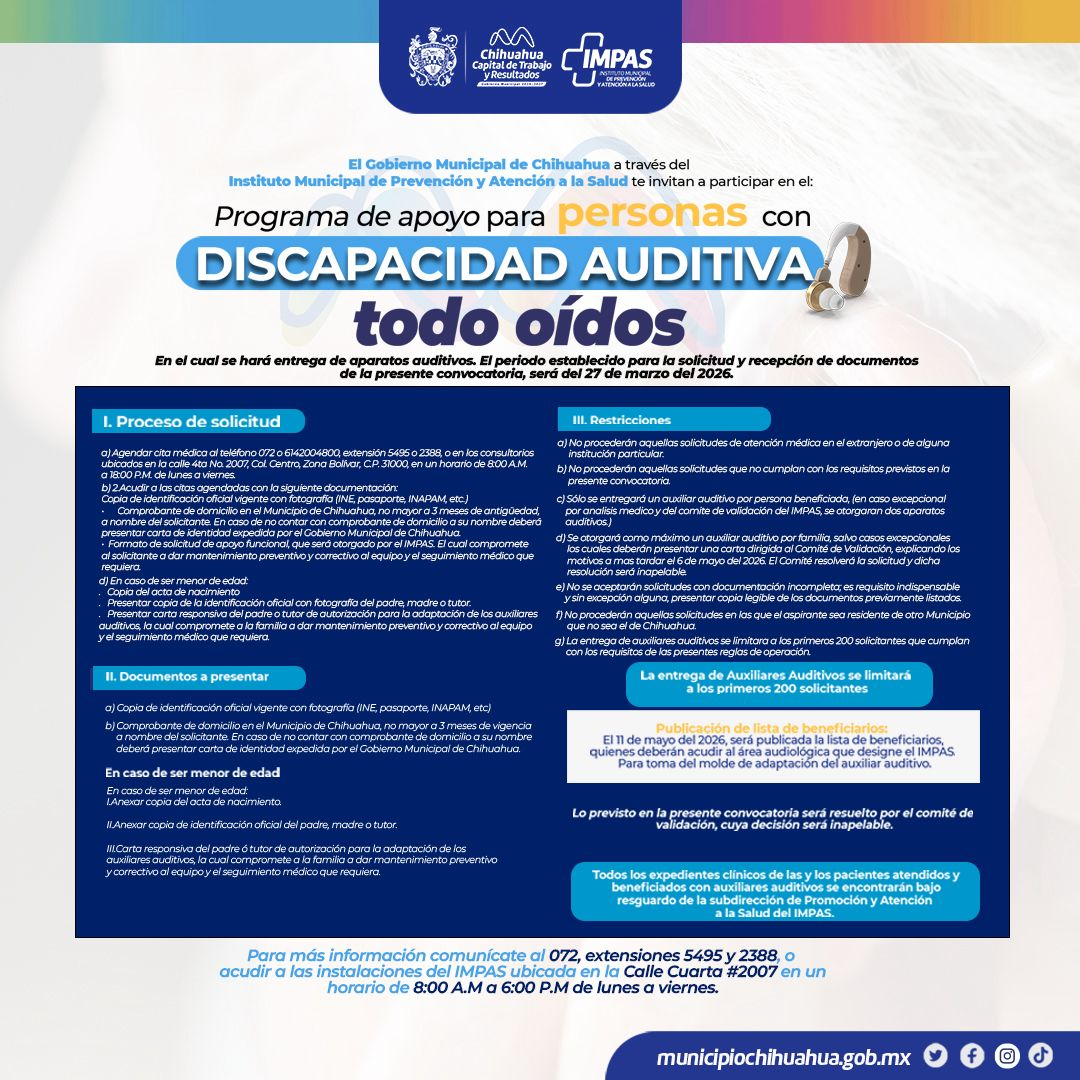 El Gobierno Municipal invita a personas con discapacidad auditiva a aprovechar este apoyo antes del cierre de la convocatoria. El Gobierno Municipal de Chihuahua, a través del Instituto Municipal de Prevención y Atención a la Salud (IMPAS), recordó que continúa abierta la convocatoria “Todo Oídos”, mediante la cual se entregan aparatos auditivos de forma gratuita a personas con discapacidad auditiva. Este programa tiene como objetivo mejorar la comunicación y la calidad de vida de las y los chihuahuenses, facilitando su integración en actividades cotidianas como la escuela, el trabajo y el entorno familiar. Para participar, es necesario agendar una cita de valoración previa llamando al 072, extensiones 5495 o 2388, donde el personal del IMPAS proporcionará información detallada sobre el proceso a seguir. Las personas interesadas deberán presentar copia de identificación oficial y comprobante de domicilio. En el caso de menores de edad, también se solicita acta de nacimiento, identificación oficial del padre, madre o tutor, así como una carta responsiva que autorice la adaptación del aparato auditivo. La convocatoria está dirigida a personas de entre 14 y 70 años de edad, y permanecerá abierta hasta el próximo 27 de marzo de 2026, por lo que las autoridades exhortaron a la ciudadanía a no dejar pasar esta oportunidad. El Gobierno Municipal reiteró su compromiso de acercar apoyos de salud a la población, especialmente a quienes enfrentan condiciones que afectan su bienestar y desarrollo, impulsando acciones que contribuyan a una sociedad más incluyente. Este tipo de programas representa un esfuerzo por brindar atención directa a quienes más lo necesitan, fortaleciendo la política social del municipio en materia de salud y asistencia. Navegación de entradas Refuerzan prevención del bullying en primaria de Cuauhtémoc: DSPM interviene con alumnos y padres PRI Chihuahua impulsa liderazgo activo ante crisis social y llama a no normalizar los problemas del país