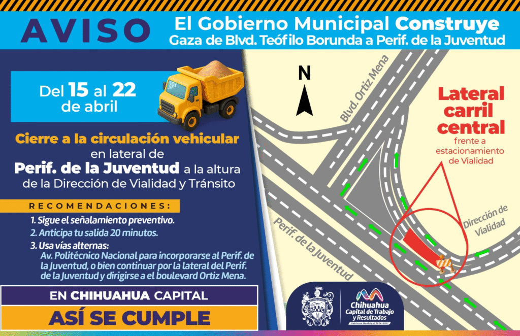 Trabajos iniciarán el 15 de abril y buscan garantizar servicios básicos durante la construcción de la gaza de incorporación. El Gobierno Municipal de Chihuahua reiteró que se llevará a cabo el cierre temporal de un tramo de la lateral del periférico de la Juventud, a la altura de la Dirección de Vialidad y Tránsito, como parte de los trabajos de modernización y reubicación de la línea de agua potable. De acuerdo con la Dirección de Obras Públicas, encabezada por Carlos Rivas, las labores iniciarán el miércoles 15 de abril a partir de las 8:00 de la mañana y concluirán el 22 de abril, periodo durante el cual se restringirá la circulación en este punto clave de la ciudad. Las autoridades señalaron que esta intervención forma parte de la construcción de la gaza de incorporación, una obra estratégica que busca mejorar la movilidad en la capital, además de garantizar el correcto funcionamiento de los servicios básicos en la zona. Ante ello, se exhortó a la ciudadanía a tomar precauciones y seguir las recomendaciones emitidas, como respetar el señalamiento preventivo instalado en el área, anticipar sus traslados saliendo con al menos 20 minutos de anticipación, y utilizar vías alternas para evitar congestionamientos. Entre las rutas sugeridas se encuentran la avenida Politécnico Nacional para incorporarse al periférico de la Juventud, así como continuar por la lateral y dirigirse hacia el bulevar Ortiz Mena, dependiendo del destino de los conductores. El Gobierno Municipal reiteró que estas acciones forman parte de un esfuerzo por mejorar la infraestructura urbana y la movilidad en Chihuahua Capital, destacando que, aunque las molestias son temporales, los beneficios serán permanentes para miles de usuarios. Navegación de entradas El PRI Chihuahua a través del diputado Alex Domínguez advierte impacto por desaparición de fondos y falta de apoyo federal en Chihuahua Detienen a mujer con casi ocho kilos de cristal en Ciudad Juárez