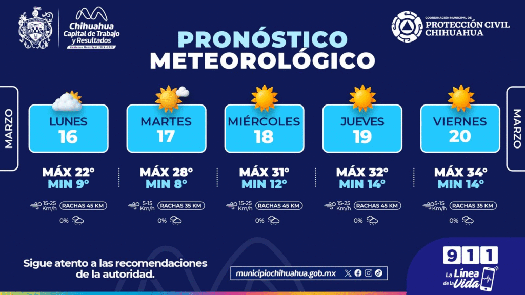 Protección Civil Municipal alertó por un aumento gradual en las temperaturas y pidió a la población tomar precauciones para evitar afectaciones a la salud. La Coordinación Municipal de Protección Civil de Chihuahua informó que durante la semana del 16 al 20 de marzo se espera un incremento gradual en las temperaturas, por lo que exhortó a la ciudadanía a tomar medidas preventivas ante el regreso del calor en la capital del estado. De acuerdo con el pronóstico del Servicio Meteorológico Nacional, las condiciones climáticas cambiarán progresivamente a lo largo de la semana, con días cada vez más cálidos y presencia de rachas de viento en distintos momentos. Para este lunes, se pronostica una temperatura máxima de 22°C y mínima de 9°C, con cielo mayormente nublado y ráfagas de viento que podrían alcanzar hasta los 45 kilómetros por hora. El martes se espera un aumento en la temperatura, con máxima de 28°C y mínima de 8°C, además de cielo mayormente soleado y vientos con rachas de hasta 35 kilómetros por hora. Para el miércoles, el calor continuará intensificándose, con temperatura máxima de 31°C y mínima de 12°C, condiciones soleadas y vientos que podrían alcanzar hasta los 45 kilómetros por hora. En el caso del jueves, se pronostica una temperatura máxima de 32°C y mínima de 14°C, con cielo despejado en gran parte del día. Finalmente, para el viernes, el pronóstico indica que el termómetro podría alcanzar hasta los 34°C como temperatura máxima, con mínima de 14°C, cielo soleado y vientos ligeros. Ante este panorama, la Coordinación Municipal de Protección Civil recomendó a la población mantenerse hidratada, así como evitar la exposición prolongada al sol durante las horas de mayor intensidad, especialmente entre el mediodía y las primeras horas de la tarde. También se aconseja asegurar objetos que puedan desprenderse ante las ráfagas de viento, ya que algunas jornadas podrían presentar condiciones ventosas. El Gobierno Municipal de Chihuahua invitó a la ciudadanía a mantenerse informada a través de los canales oficiales, así como reportar cualquier emergencia al número 9-1-1, con el objetivo de atender oportunamente cualquier situación derivada de las condiciones climáticas. Navegación de entradas Detienen a presunto agresor por secuestro y violación en Guadalupe y Calvo; víctima se quitó la vida días después Operativo permanente en Guachochi: SSPE refuerza vigilancia y desactiva pista clandestina en la sierra